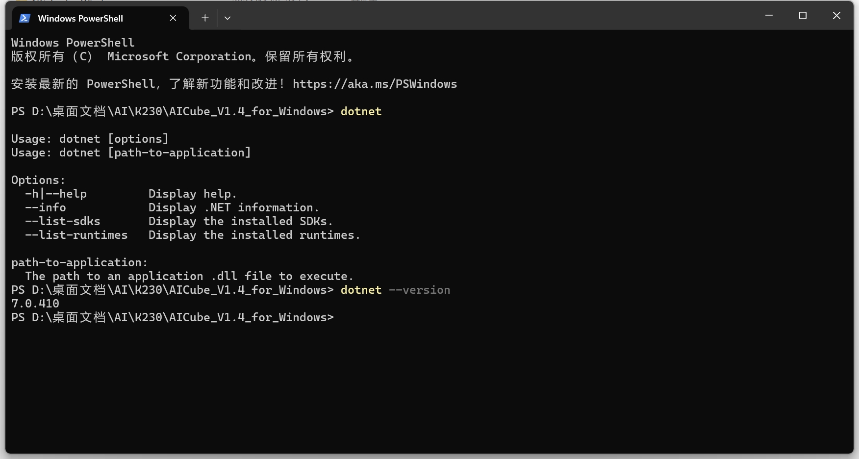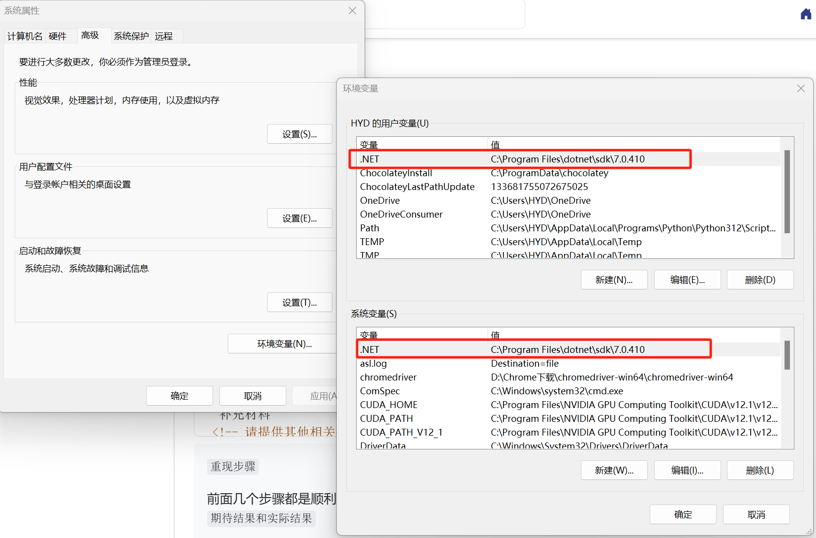 初步排查是.NET没有安装成功,于是重新下载安装了文档中的.NET,并且在环境变量中进行了配置,在powershell里输入dotnet也可以看见是正常运行的。