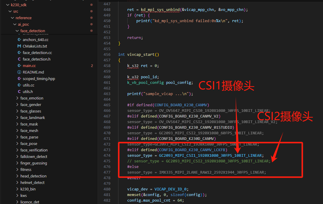 庐山派上用v1.9的linux+RTSmart SDK跑ai_poc里face_detection例程,目前摄像头接csi2接口能在LCD上跑通,但是把摄像头接到cs1接口就提示如下错误,两种方式修改的地方如下: