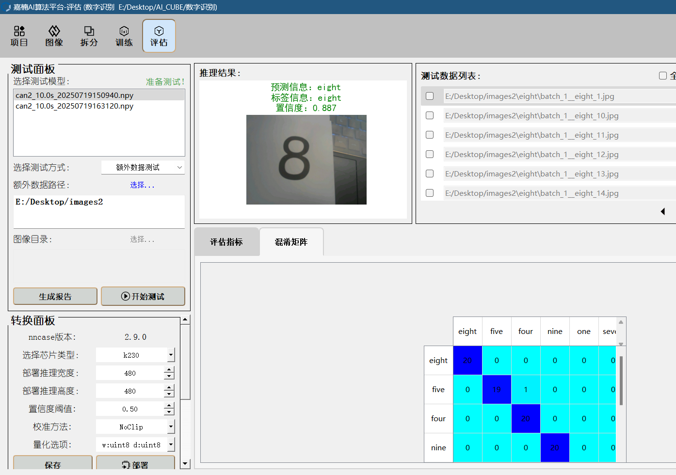 怀疑训练集太小,所以重新拍了0~9的数字各20张,作为外部测试集导入AICube进行测试,发现识别准确率在95%以上。保持代码完全一致,将模型和配置文件替换为线上云训练的模型和配置文件,发现能够准确识别。
