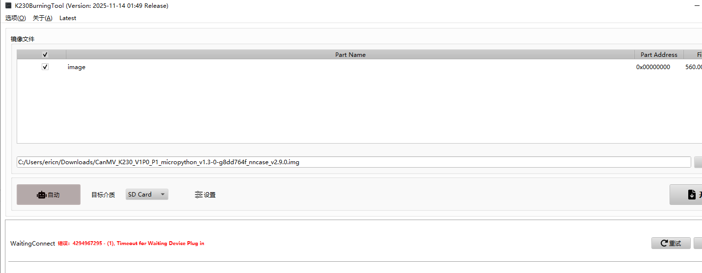 canMV-K230-V1.1 创博开发板,通过SD卡烧了固件CanMV_K230_V1P0_P1_micropython_v1.4-0-g6cce59c_nncase_v2.9.0.img.gz ,SD卡插入开发板,两根usb都插入windows电脑,提示未知usb设备,所需电量超过电脑供给,然后换了个电脑插入usb,能看到指示灯在一直闪红灯,电脑上也没有串口设备发现,是哪里出问题了吗?