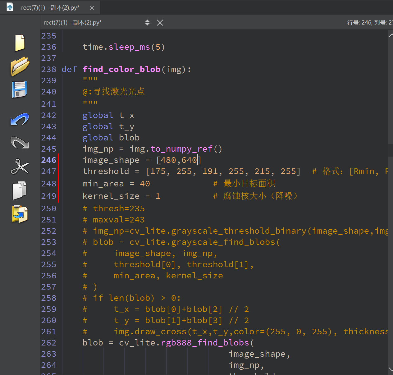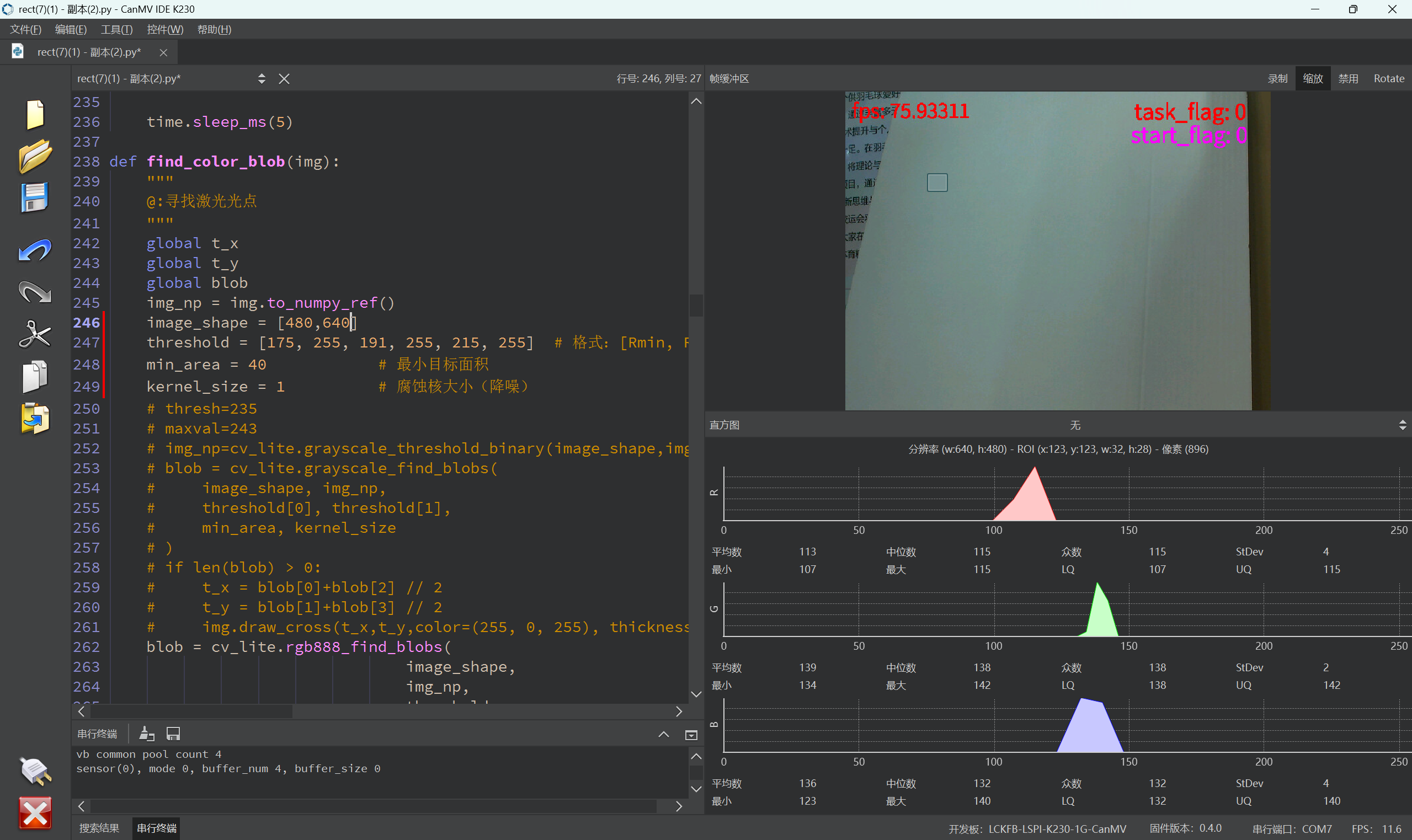 执行CV_lite中的rgb888_find_blobs,调整阈值发现只有下半部分屏幕可以识别到,代码如图1