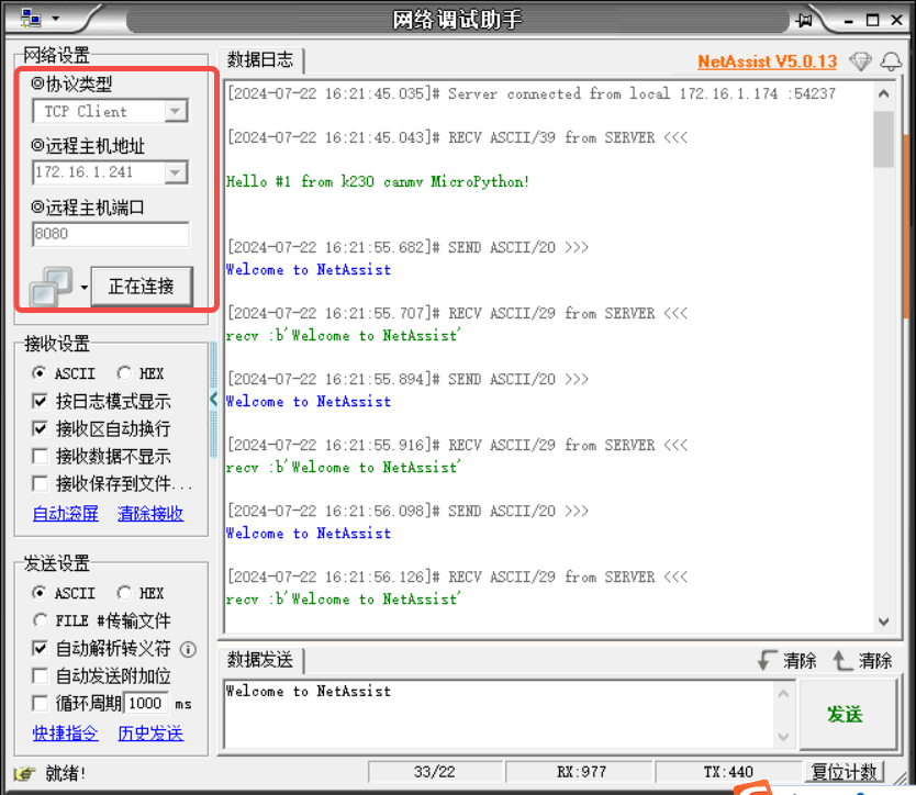 打开 NetAssist 网络调试助手,配置为 TCP 客户端,并输入服务端终端显示的 IP 地址和端口号,点击 “连接”: