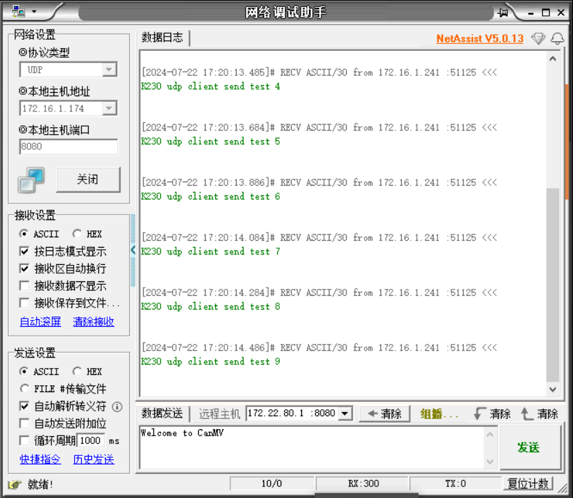运行例程后,NetAssist 将显示接收到的 UDP 数据包:
